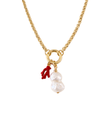This carabiner style necklace comes on a 4mm gold plated rolo chain with a ring carabiner that opens and closes. You can buy additional charms to interchange at any time. Included are a hand strung baroque pearl and red enamel coral charm.