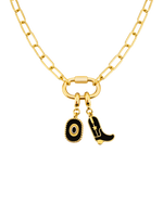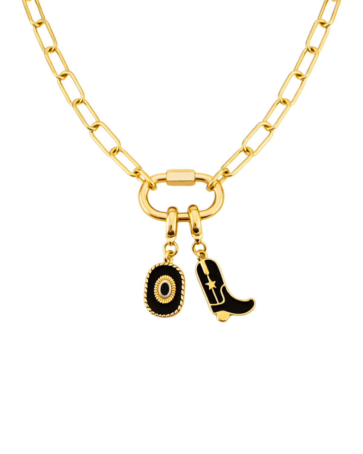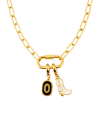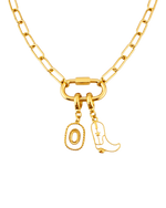 A bold, western-inspired statement piece, this necklace features a sturdy gold-plated carabiner with striking charms that capture the spirit of the wild west. With a standout cowboy boot and a cowboy hat, this piece adds a touch of adventure and edge to any look. Perfect for those who like to combine rugged style with a bit of sophistication, this necklace is ideal for making a statement, whether you're dressing up or keeping it casual.